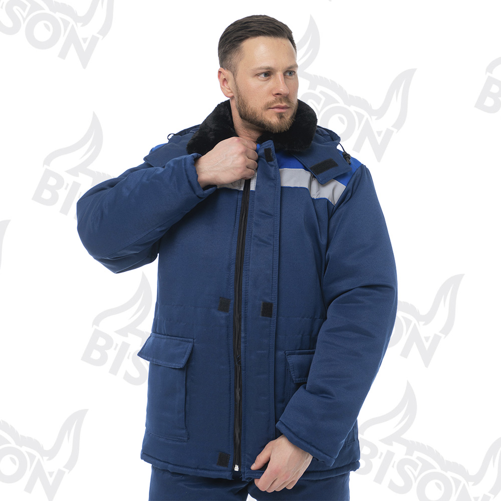 Костюм утепленный "ПОЛЮС СТАНДАРТ БИЗОН" изготовлен в соответствии с ГОСТ и включает в себя 2 предмета: куртка / полукомбинезон. Удлиненная куртка прямого силуэта с ветрозащитной планкой с застежкой на ленту-контакт. На куртке расположены накладные карманы с клапанами с застежкой на ленту-контакт. Ширина изделия регулируется по талии куртки. Изделие оснащено утепленным съемным капюшоном и меховым воротником. Центральная застежка утепленного полукомбинезона - молния. Полукомбинезон фиксируется бретелями с эластичной резинкой, на нем расположены накладные карманы с наклонным входом. Для безопасной работы сотрудника в местах с плохим освещением на костюме «ПОЛЮС СТАНДАРТ БИЗОН» предусмотрена световозвращающая полоса шириной 50 мм.